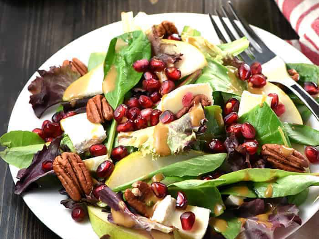 - Immediately after cutting the pear slices, place them in a large plastic baggie and squeeze fresh lemon juice over them. Close bag and gently shake to coat. In a large salad bowl, layer salad greens, pear slices, pieces of Brie, pomegranate seeds, and toasted pecans. Just before serving, dress with desired amount of Balsamic Vinaigrette and toss until salad ingredients are evenly coated.